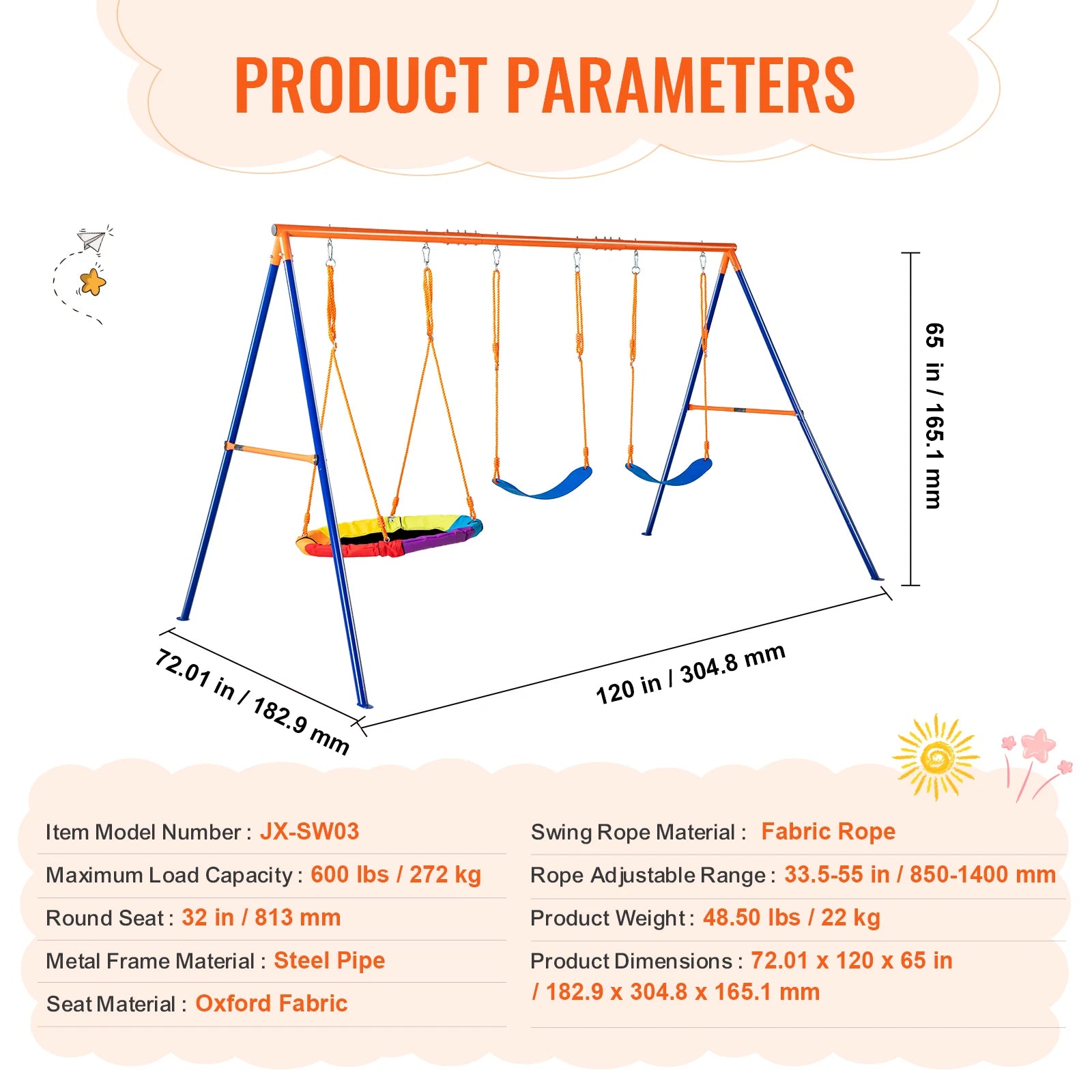 Premium Seat: Our swing sets for backyard come with a high-quality Oxford fabric seat, known for durability and colorfastness. They are resistant to wear and tear even after prolonged use. Adjustable high-quality PE ropes are sun-resistant and do not fade over the years.